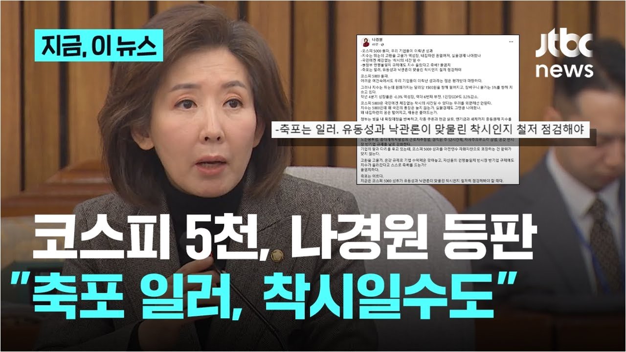 나경원 의원은 이에 대해 "지수 올라갔다고 스스로 축배를 드는가? 몰염치하다"라며 정부를 강하게 비판했습니다. 나 의원은 코스피 5000 돌파가 우리 기업들의 성과라는 점은 인정하면서도, 원화 가치 하락과 장바구니 물가 상승 등 국민들이 체감하는 경제적 어려움을 지적했습니다. 그는 코스피 5000이 '국민에겐 체감 없는 착시의 시간일 수 있다'는 우려를 외면해서는 안 된다고 주장하며, '지수는 5000인데 왜 국민의 통장은 늘지 않는가. 실물경제도 그만큼 나아졌느냐'고 반문했습니다. 이는 주가 지수와 실물 경제 간의 괴리에 대한 중요한 질문을 던지고 있습니다.