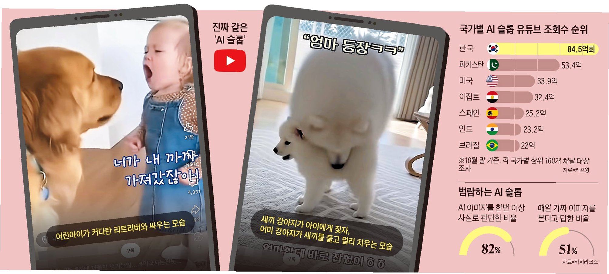 한편, 카프윙이 국가별 유튜브 채널 상위 100개를 분석한 결과, 한국이 슬롭 영상 소비에서 세계 1위였다. 한국은 '슬롭을 가장 많이 보고, 만들고, 퍼뜨리는 나라'였다. 한국발 AI 슬롭 채널 조회 수는 약 84억5000만 회로 2위 파키스탄(약 53억 회), 3위 미국(약 34억 회)을 크게 앞섰다. 이러한 결과는 한국 사회가 슬롭 콘텐츠에 얼마나 깊이 노출되어 있는지를 보여준다. 슬롭 콘텐츠 소비가 높은 데에는 다양한 요인이 작용할 수 있지만, 무엇보다도 이에 대한 심각성을 인지하고, 문제 해결을 위한 노력을 기울여야 한다.